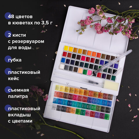 Акварель художественная кюветы НАБОР 48 цветов по 3,5 г, пластиковый кейс, BRAUBERG ART CLASSIC, 191772