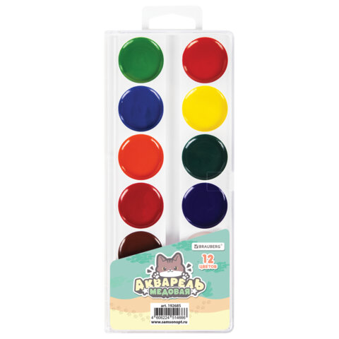 Краски акварельные BRAUBERG "МИЛЫЕ КОТЫ", медовые, 12 цветов, круглые кюветы, 192685