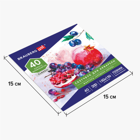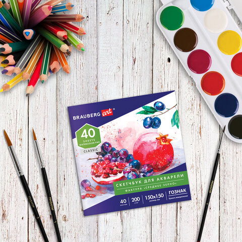 Альбом для акварели, бумага ГОЗНАК СПб 200 г/м2, 150x150 мм, 40 л., склейка, BRAUBERG ART, 106144