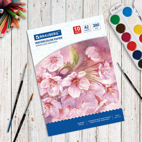 Бумага для акварели БОЛЬШАЯ А2, 10 л., 200 г/м2, 400х590 мм, BRAUBERG, "Цветы", 125223