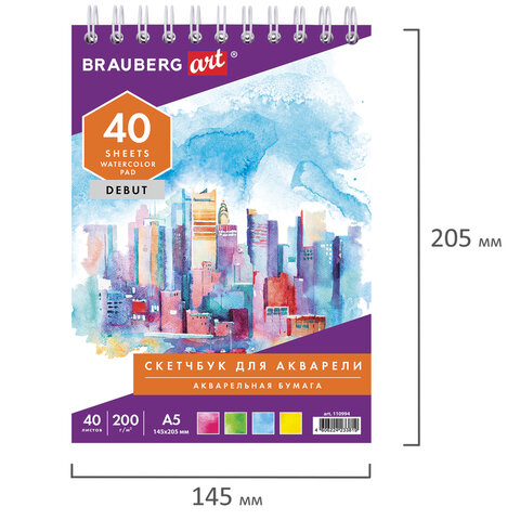 Скетчбук, акварельная белая бумага 200 г/м ГОЗНАК, 145х205 мм, 40 л., гребень, подложка, BRAUBERG ART DEBUT, 110994