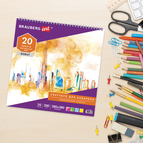 Скетчбук, акварельная белая бумага 200 г/м2 ГОЗНАК, 280х280 мм, 20 л., гребень, подложка, BRAUBERG ART DEBUT, 110992