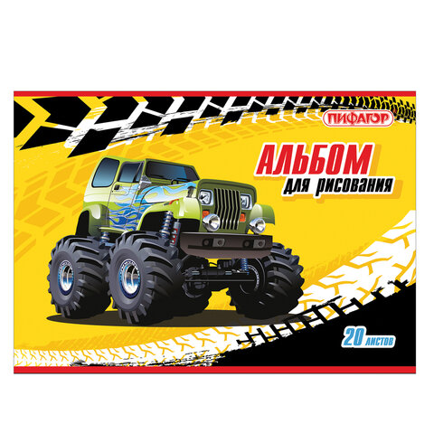 Альбом для рисования, А4, 20 л., скоба, обложка офсет, ПИФАГОР, 200х285 мм, "Машинки" (2 вида), 104868