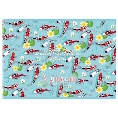 Альбом для рисования А4, 24 листа, скоба, обложка картон, BRAUBERG, 203х288 мм, "КАРПЫ КОИ" (4 вида), 107107