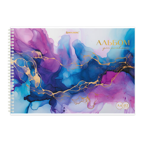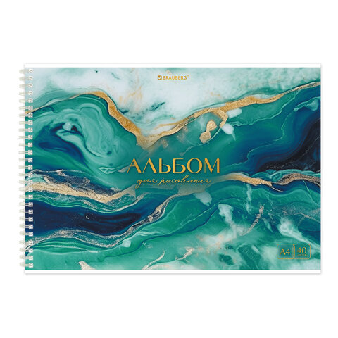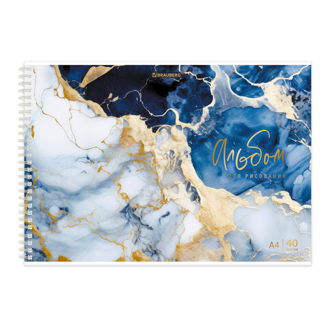 Альбом для рисования А4, 40 л., гребень, обложка картон, BRAUBERG, 195х285 мм, "МРАМОР" (4 вида), 107121