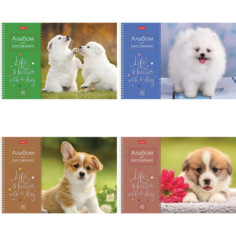 Альбом для рисования А4 40 л., спираль, обложка картон, HATBER, 205х290 мм, "Doggie-Щенки" (4 вида), 067478, 40А4Всп