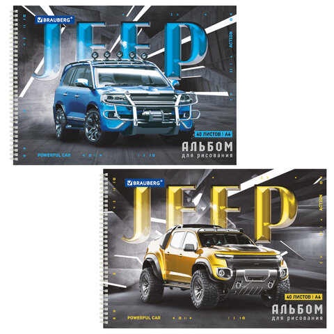Альбом для рисования, А4, 40 листов, гребень, обложка картон, BRAUBERG, 195х285 мм, "Джипы" (2 вида), 106709