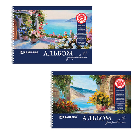 Альбом для рисования, А4, 40 листов, гребень, обложка картон, BRAUBERG, 205х290 мм, "Пейзаж с цветами" (2 вида), 103730