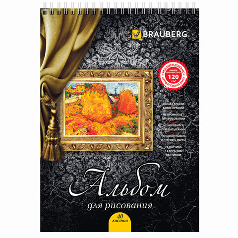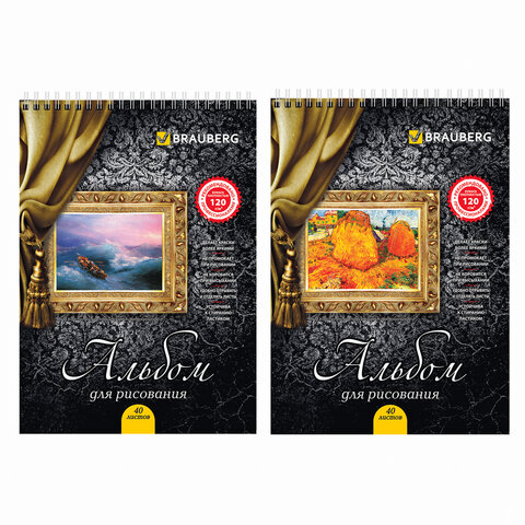 Альбом для рисования, А4, 40 листов, гребень, выборочный лак, подложка, 120 г/м2, BRAUBERG, 205х290 мм, "Картина" (2 вида), 102834