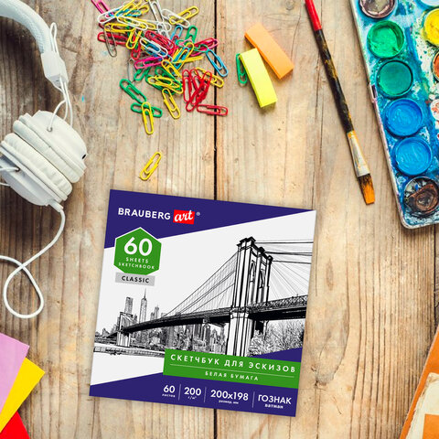 Альбом-скетчбук для рисования, ватман ГОЗНАК 200 г/м2 200х198 мм, 60 л., склейка, BRAUBERG ART CLASSIC, 105909