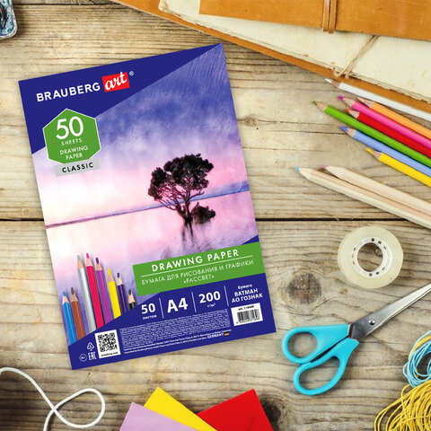 Бумага для рисования и графики в коробе А4, 50 л., 200 г/м2, ВАТМАН ГОЗНАК СПб, BRAUBERG ART, 114489