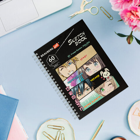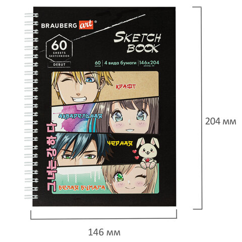 Скетчбук, 4 типа бумаги (акварельная, белая, черная, крафт) 146х204 мм, 60 л., гребень, BRAUBERG ART DEBUT, АНИМЕ, 115066