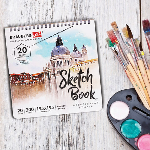 Скетчбук, акварельная бумага 200 г/м2, 195х195 мм, 20 л., гребень, твердая обложка, BRAUBERG ART, 112979
