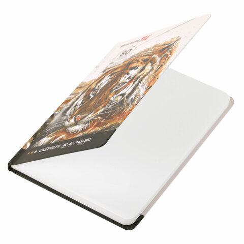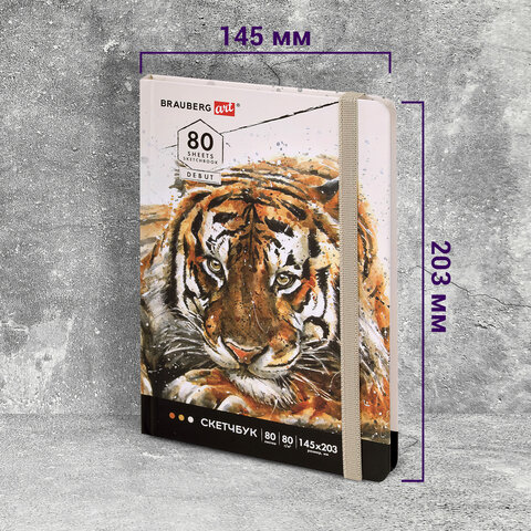 Скетчбук, белая бумага 80 г/м2, 145х203 мм, 80 л., резинка, твердый, BRAUBERG ART DEBUT "Тигр", 114580