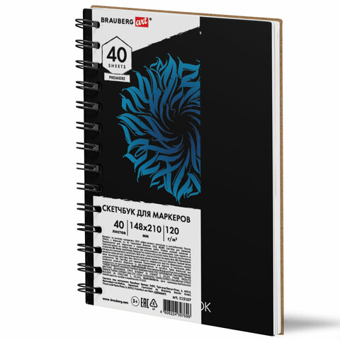 Скетчбук для маркеров 120 г/м2, 148х210 мм, 40 л., гребень, жесткая подложка, BRAUBERG ART PREMIERE, 115107