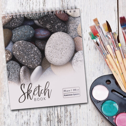 Скетчбук "КАМУШКИ" предназначен для эскизов и зарисовок в различных техниках рисования: карандаш, пастель, сангина, уголь, маркер.
