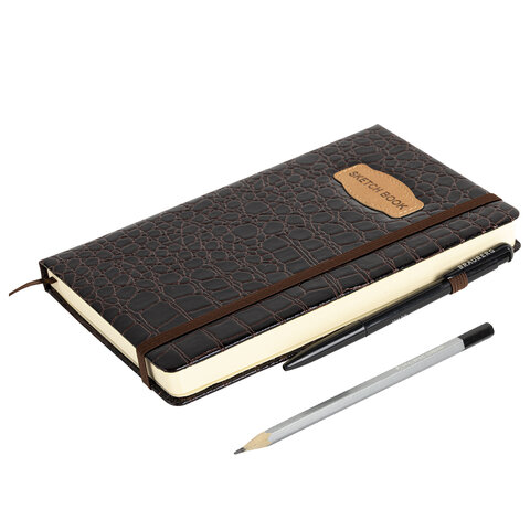 Скетчбук, слоновая кость 140 г/м2, 130х210 мм, 80 л., КОЖЗАМ, резинка, BRAUBERG ART CLASSIC, CROCO, коричневый, 116471