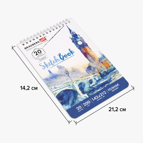 Скетчбук, ватман ГОЗНАК 200 г/м2, 142х212 мм, 20 л., гребень, твердая обложка, BRAUBERG ART CLASSIC, 112977