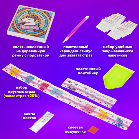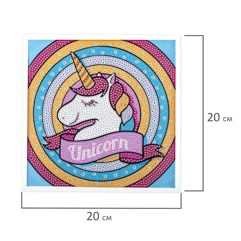 Картина стразами (алмазная мозаика) 20х20 см, ЮНЛАНДИЯ "Единорог", в деревянной рамке, 662436