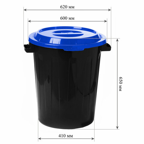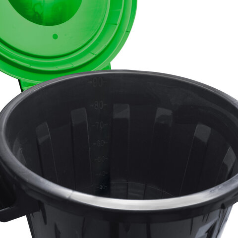90-ти литровый пластиковый контейнер / бак для мусора с крышкой. Крышка крепится к баку на специальных петлях-защелках, что позволяет ей перекидываться и держаться на петлях. Крышка оснащена защелкой. Удобные ручки для переноски.