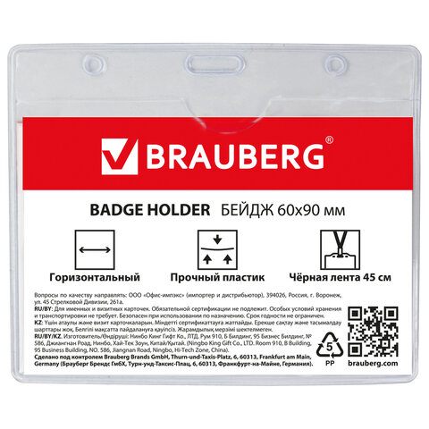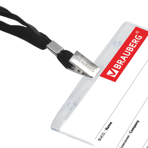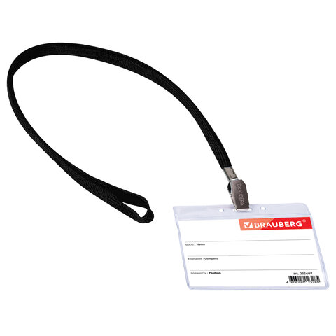 Бейдж горизонтальный (60х90 мм), на черной ленте 45 см, BRAUBERG, 235697