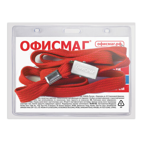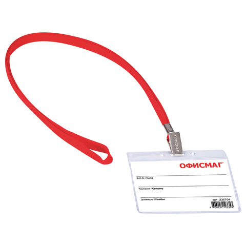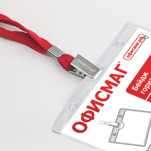 Бейдж горизонтальный (60х90 мм), на красной ленте 45 см, ОФИСМАГ, 235704