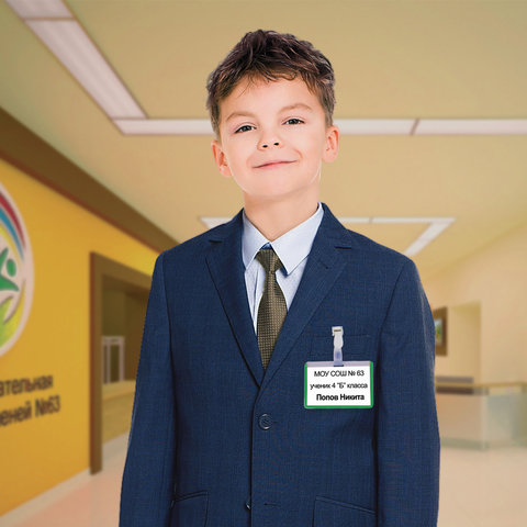 Горизонтальный бейдж школьника BRAUBERG с зеленой окантовкой используется для идентификации учащегося в образовательных учреждениях.