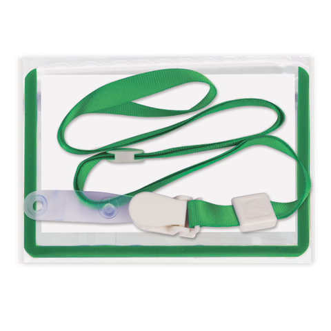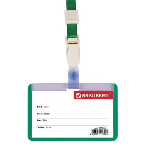 Бейдж школьника горизонтальный (55х90 мм), на ленте со съемным клипом, ЗЕЛЕНЫЙ, BRAUBERG, 235763