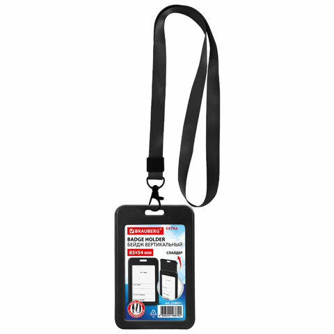 Бейдж вертикальный (85х54 мм), лента 45 см с карабином, СЛАЙДЕР, черный, BRAUBERG EXTRA, 238831