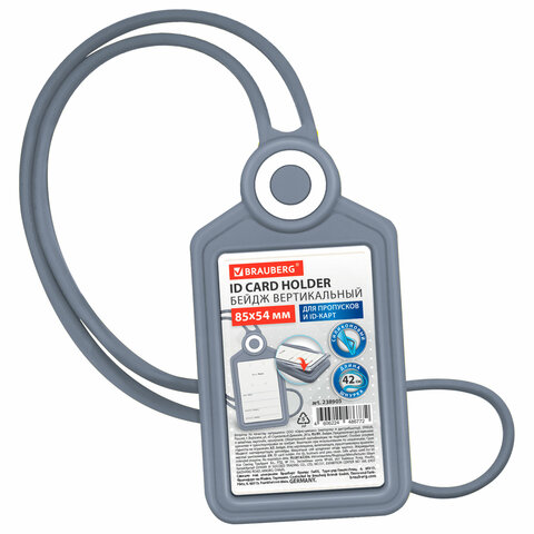 Бейдж вертикальный для пропуска и ID-карт, СИЛИКОНОВЫЙ, 85х54 мм, шнурок 42 см, серый, BRAUBERG, 238905