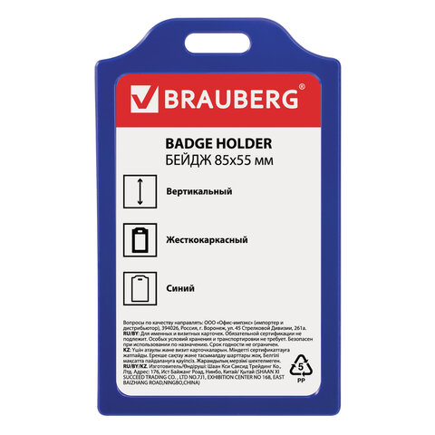 Бейдж вертикальный жесткокаркасный (85х55 мм), без держателя, СИНИЙ, BRAUBERG, 235745