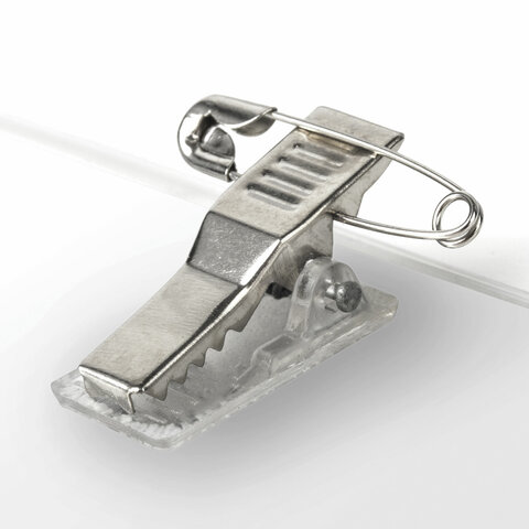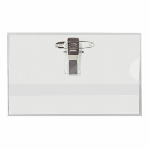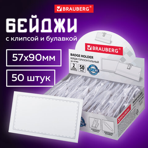 Бейдж горизонтальный (57х90 мм), КОМПЛЕКТ 50 шт., с клипсой и булавкой, жесткий, BRAUBERG, 231903