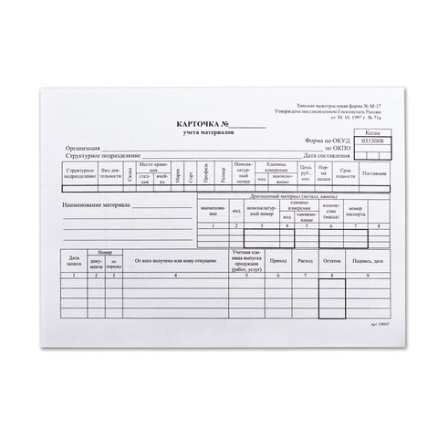 Бланк бухгалтерский, офсет плотный, "Карточка учета материалов", ф-М17, А5 (147х208 мм), КОМПЛЕКТ 50 шт., 130138