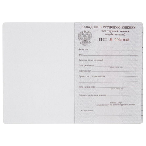 Бланк документа "Вкладыш в трудовую книжку", 88х125 мм, ГОЗНАК