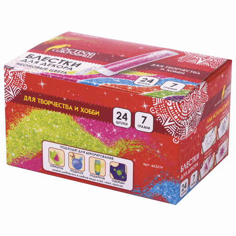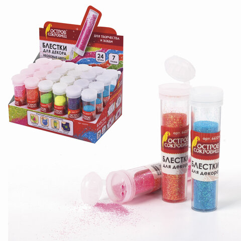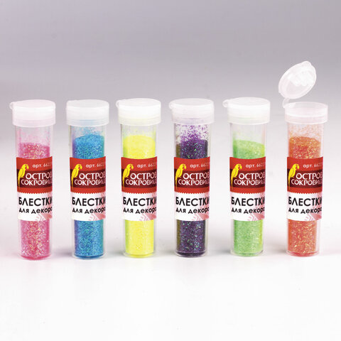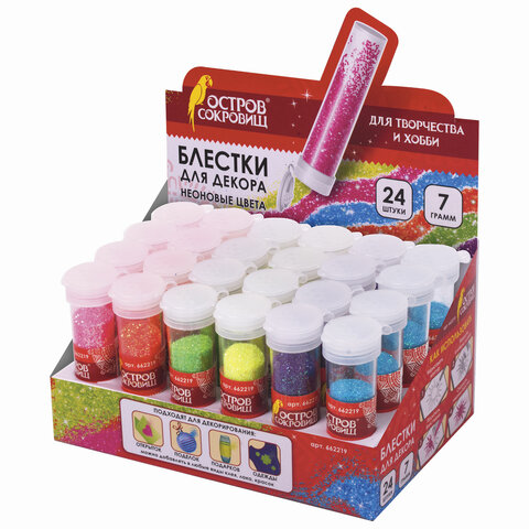 Блестки (глиттер) для декора, поделок, DIY, творчества, оформления, ОСТРОВ СОКРОВИЩ, НЕОН, 7 грамм, ассорти, в дисплее, 662219