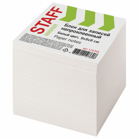 Блок для записей непроклеенный, 9х9х9 см, плотность 65 г/м2, белизна 90-92%, STAFF, 126366