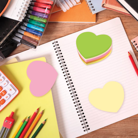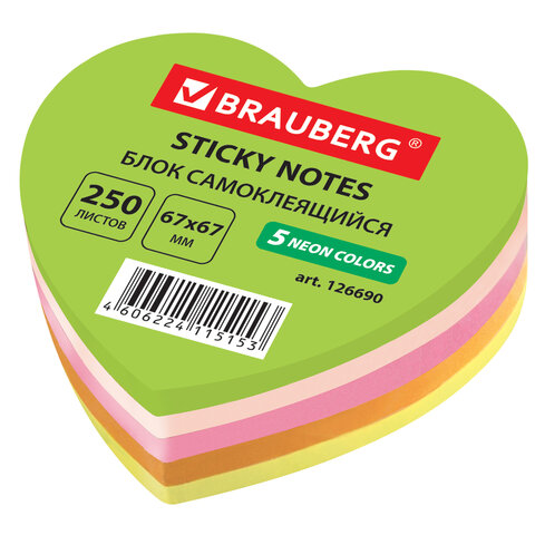 Блок самоклеящийся (стикеры), фигурный, BRAUBERG, НЕОНОВЫЙ "Сердце", 250 листов, 5 цветов, 126690