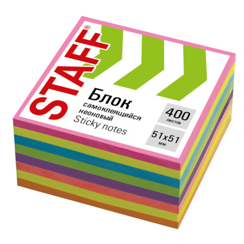 Блок самоклеящийся (стикеры), компактные, STAFF НЕОНОВЫЙ, 51х51 мм, 400 листов, 8 цветов, 115583