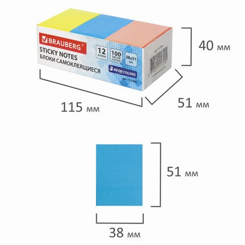 Блоки самоклеящиеся (стикеры) BRAUBERG 38х51 мм, 100 листов, НАБОР 12 штук, 3 неоновых цвета, 111345