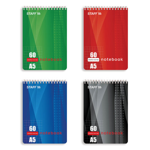 Блокнот А5, 146х205 мм, 60 л., гребень, жесткая подложка, клетка, STAFF, 4 вида, 126539