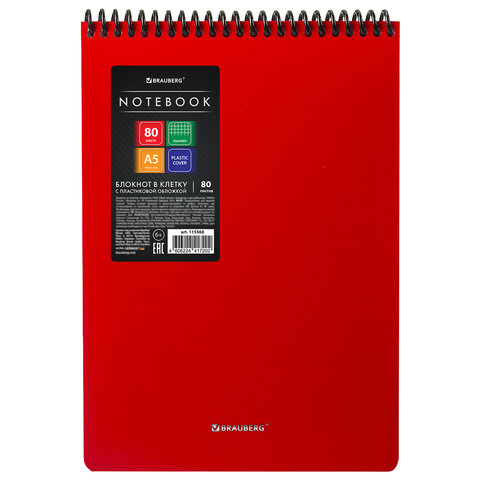 Блокнот А5, 80 л., спираль пластиковая, обложка пластик, клетка, BRAUBERG "Metropolis", КРАСНЫЙ, 115568