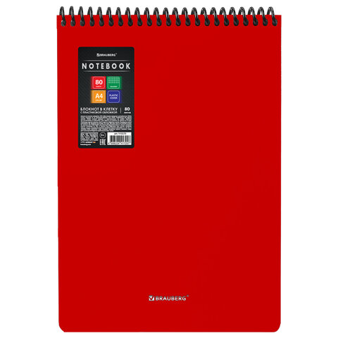 Блокнот БОЛЬШОГО ФОРМАТА А4, 80 л., обложка пластик, клетка, BRAUBERG "Metropolis", КРАСНЫЙ, 115573
