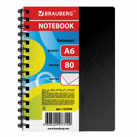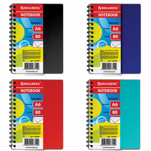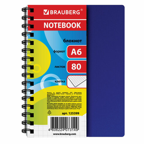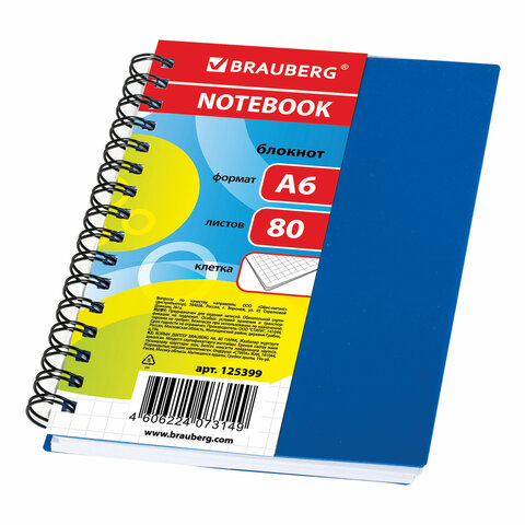 Блокнот МАЛЫЙ ФОРМАТ А6, 105х145 мм, 80 л., гребень, пластик, клетка, BRAUBERG, "Офисный", 125399