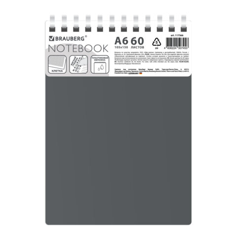 Блокнот МАЛЫЙ ФОРМАТ А6, 60 л., силиконовый гребень, обложка пластик, клетка, BRAUBERG, серый, 117566