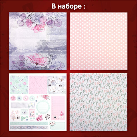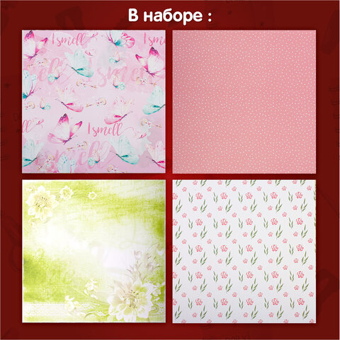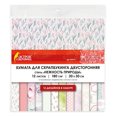 Бумага для скрапбукинга 30х30 см "Нежность природы", двусторонняя, 12 листов, 12 дизайнов, 180 г/м2, ОСТРОВ СОКРОВИЩ, 662771