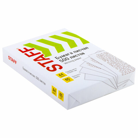 Бумага писчая А4, 65 г/м2, 500 л., Россия, белизна 92% (ISO), STAFF, 114215