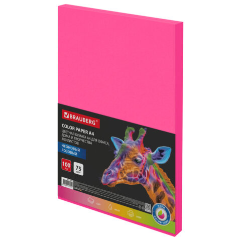 Бумага цветная BRAUBERG, А4, 75 г/м2, 100 л., НЕОН, малиновая, для офисной техники, 116669