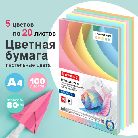 Бумага цветная BRAUBERG, А4, 80 г/м2, 100 л. (5 цветов х 20 листов), пастель, для офисной техники, 112460