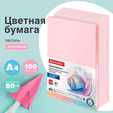 Бумага цветная BRAUBERG, А4, 80 г/м2, 100 л., пастель, розовая, для офисной техники, 112447