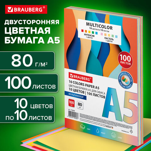 Бумага цветная МАЛОГО ФОРМАТА 10 цветов, BRAUBERG MULTICOLOR А5, 80 г/м2, 100 л., (10 цветов x 10 листов), 116406